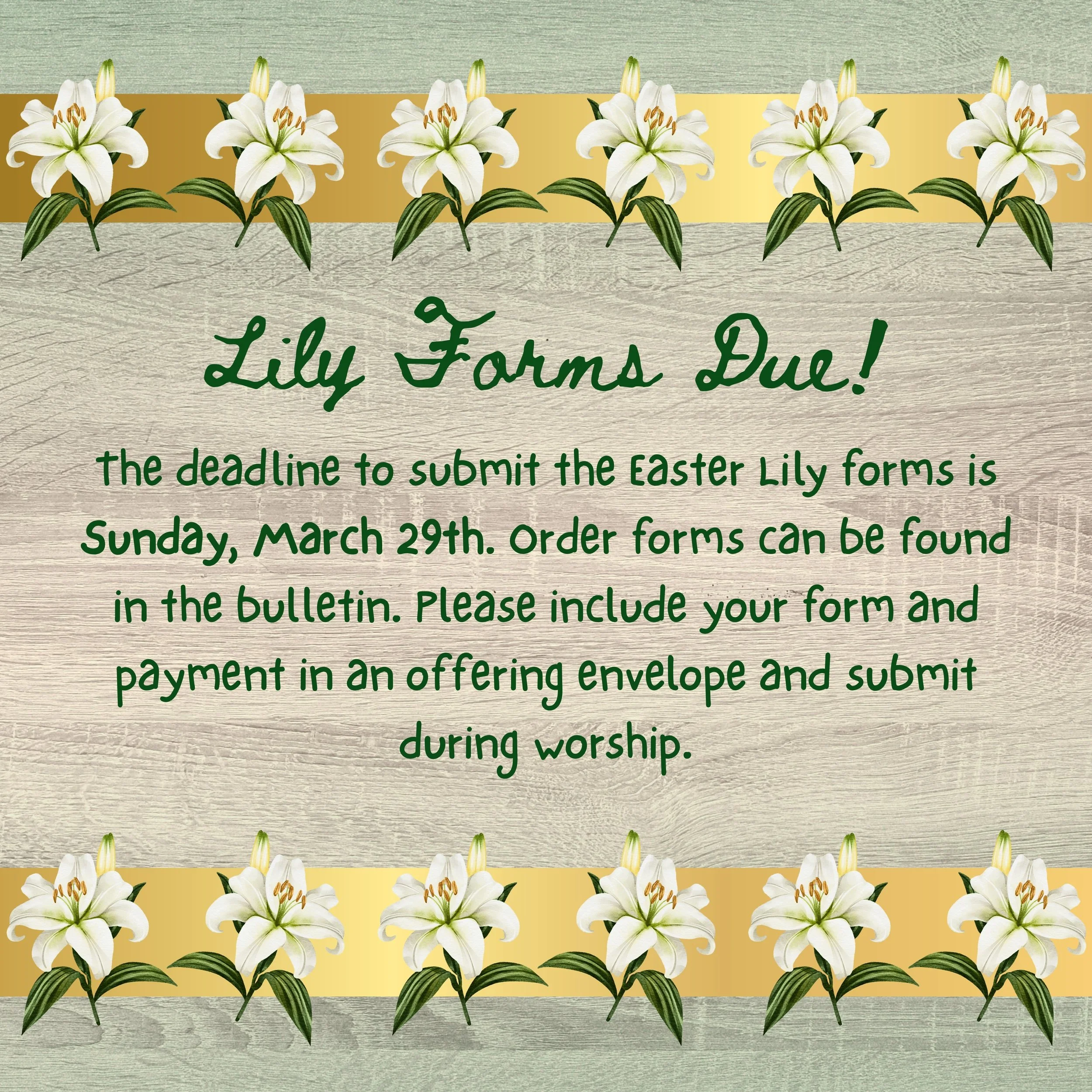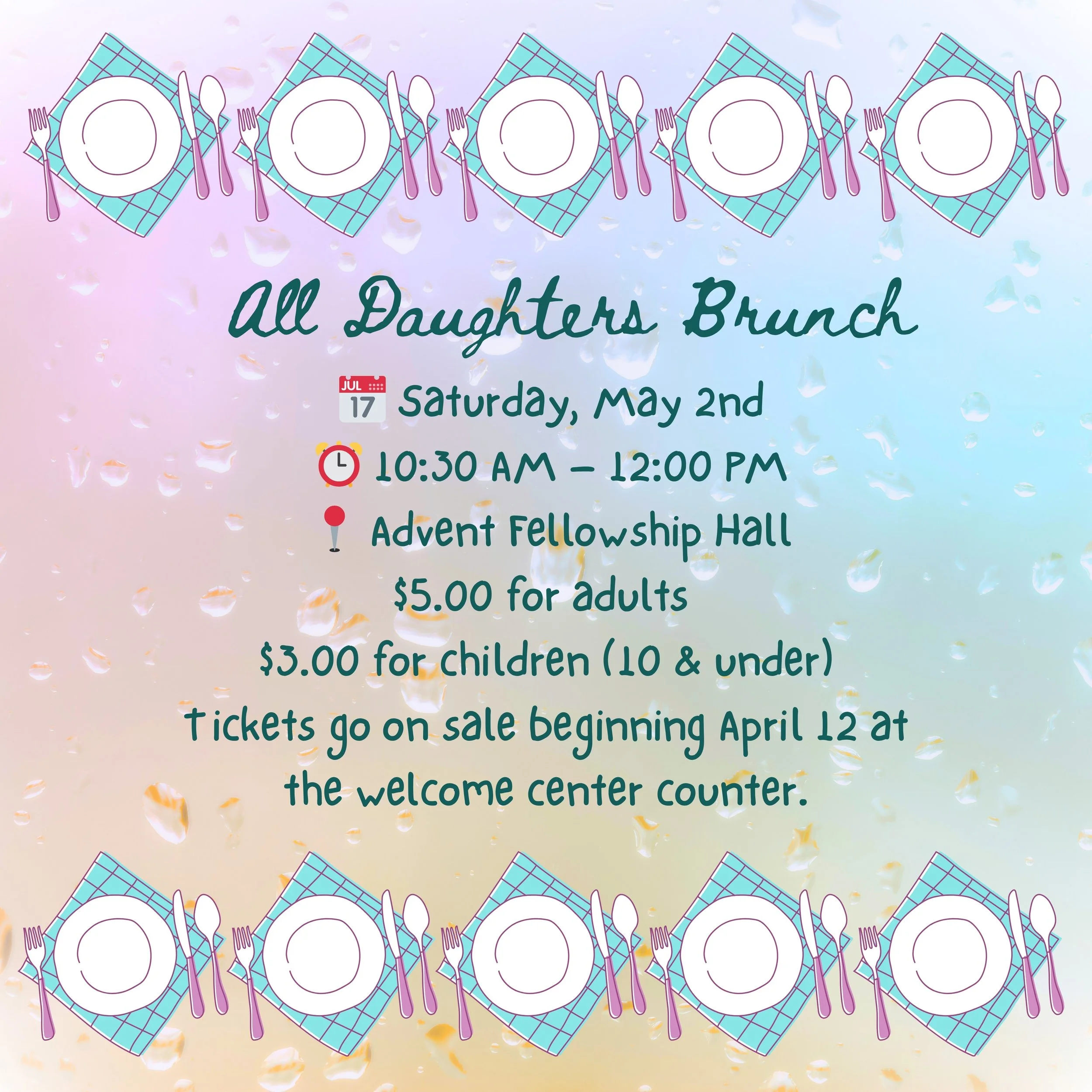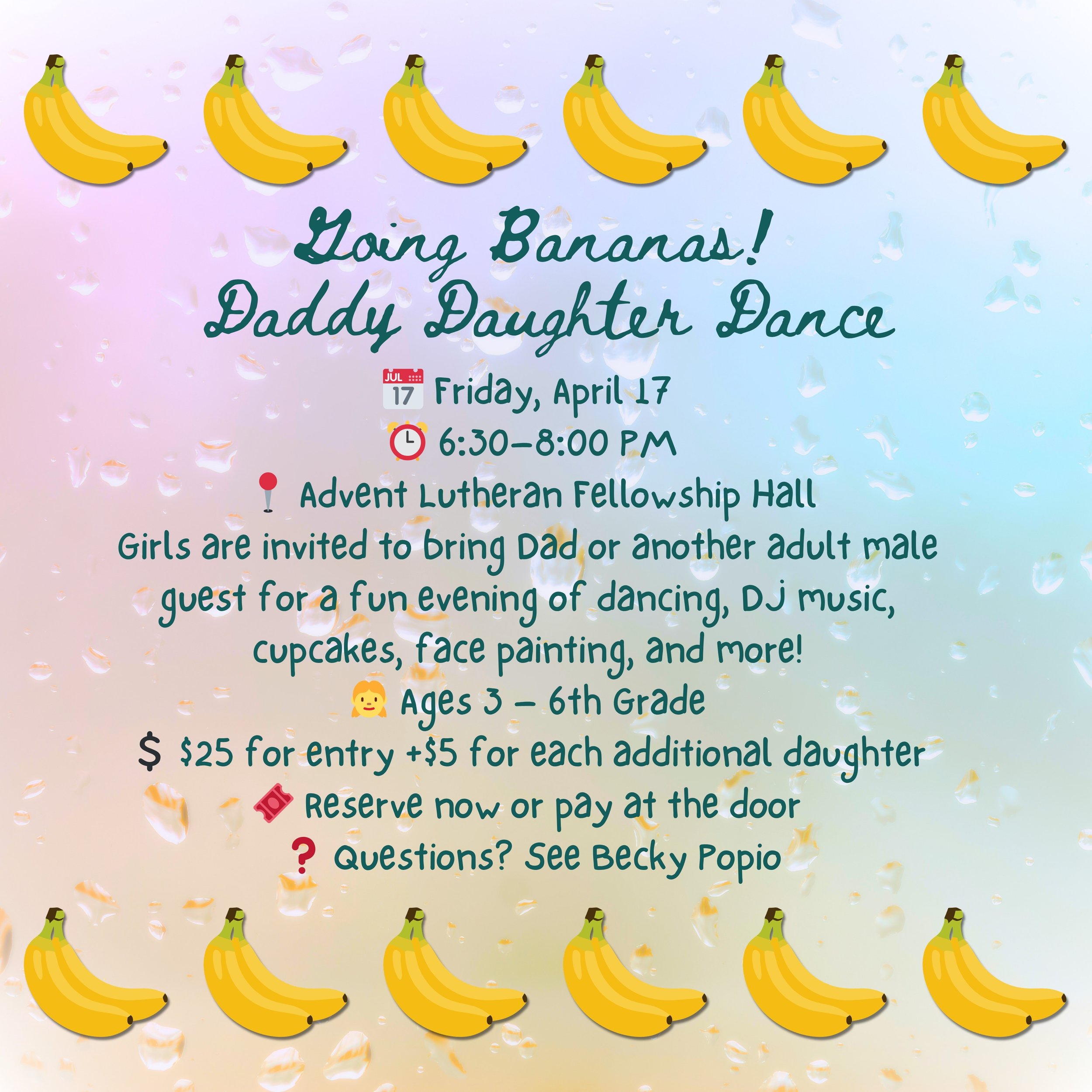 Friday, April 17th from 6:30–8:00PM – “Going Bananas!” Daddy Daughter Dance in the fellowship hall (Ages 3 yrs–6th grade).