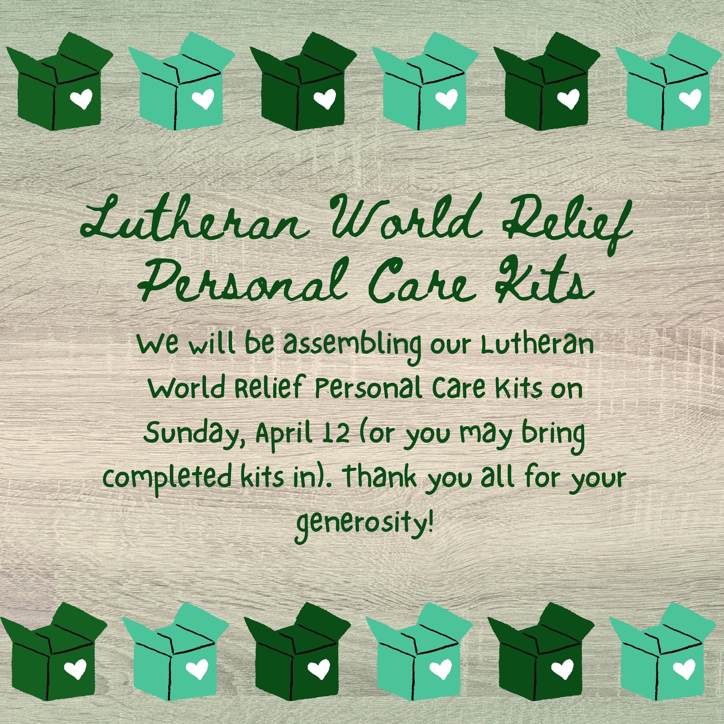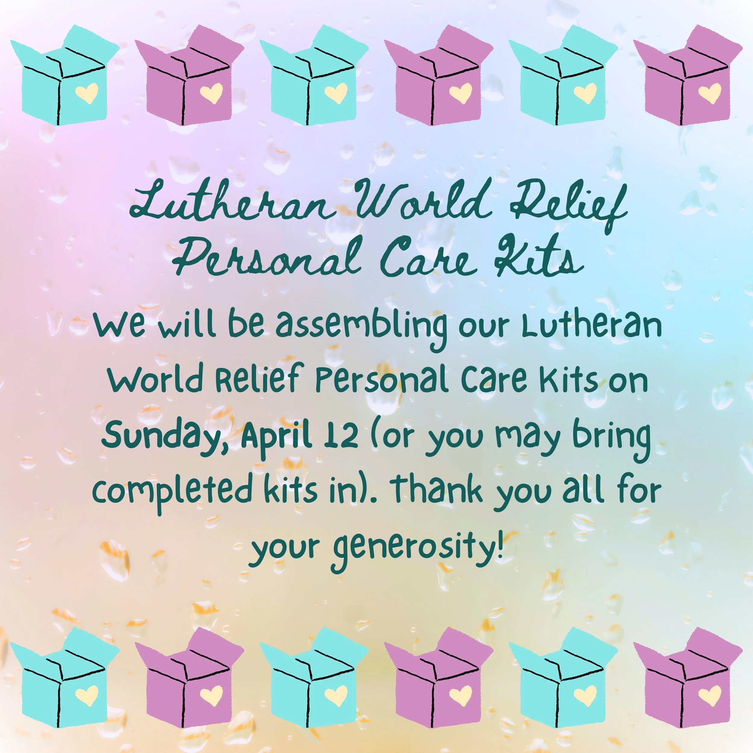 Sunday, April 12th – Lutheran World Relief Personal Care Kit Assembly (or bring completed kits)