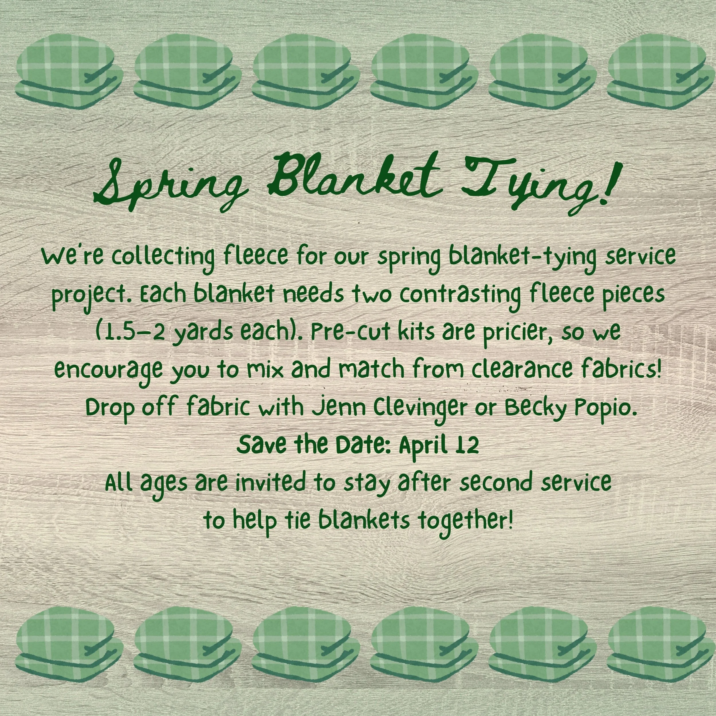 Sunday, April 26th – Fleece Blanket Tying Service Project after second service (lunch served prior).