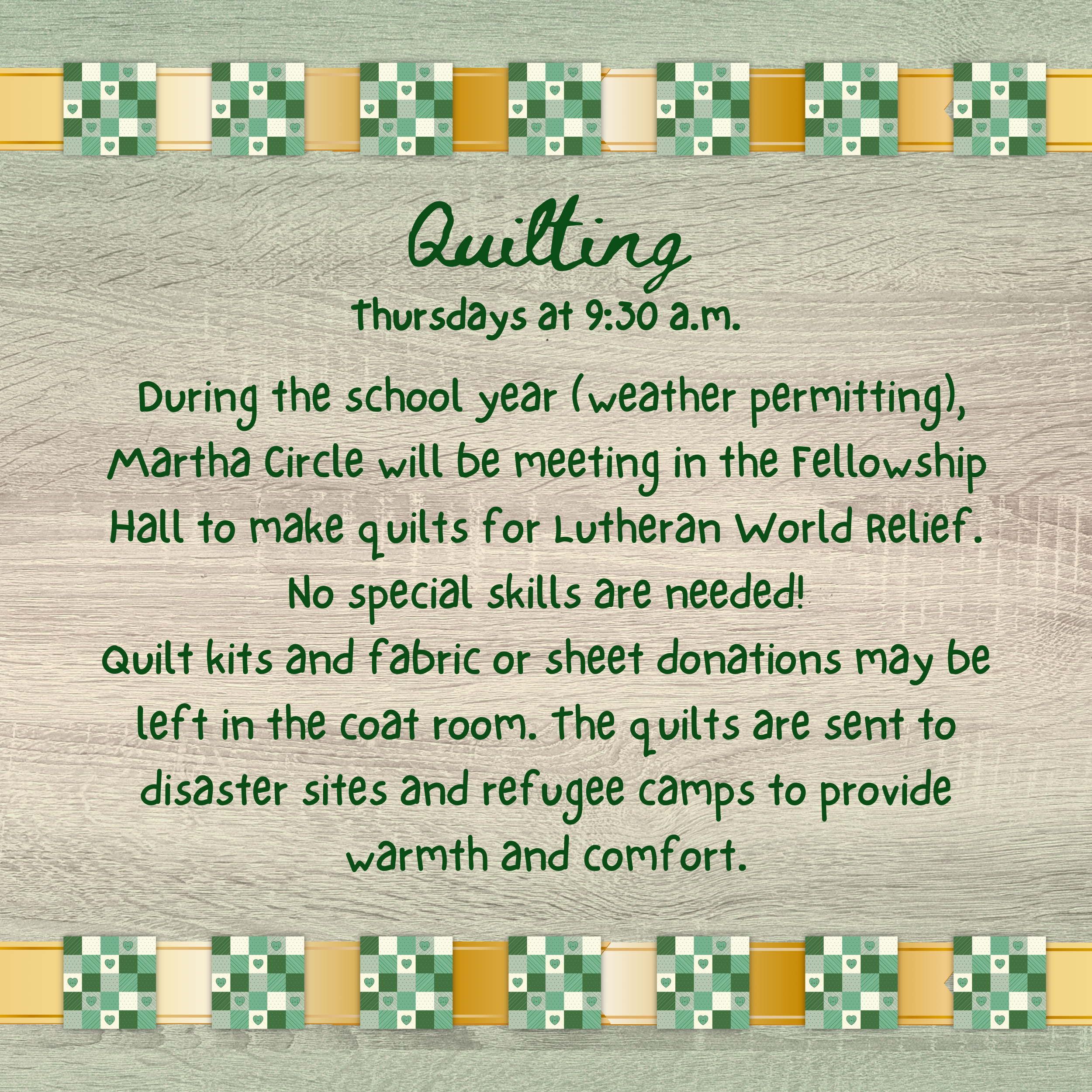 Sunday, April 12th - Lutheran World Relief Personal Card Kit Assembly. You can find the list of items in the welcome center or in the back of the weekly bulletin.