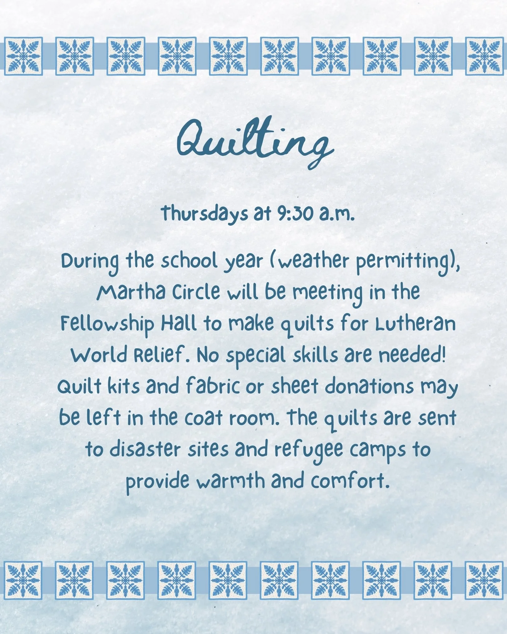 January 29th @ 9:30AM – Pastor Rev. Tim Krick from Lutheran World Relief will be visiting Advent on Jan. 29th at 9:30. You are invited to come and learn more about LWR ministries around the world.