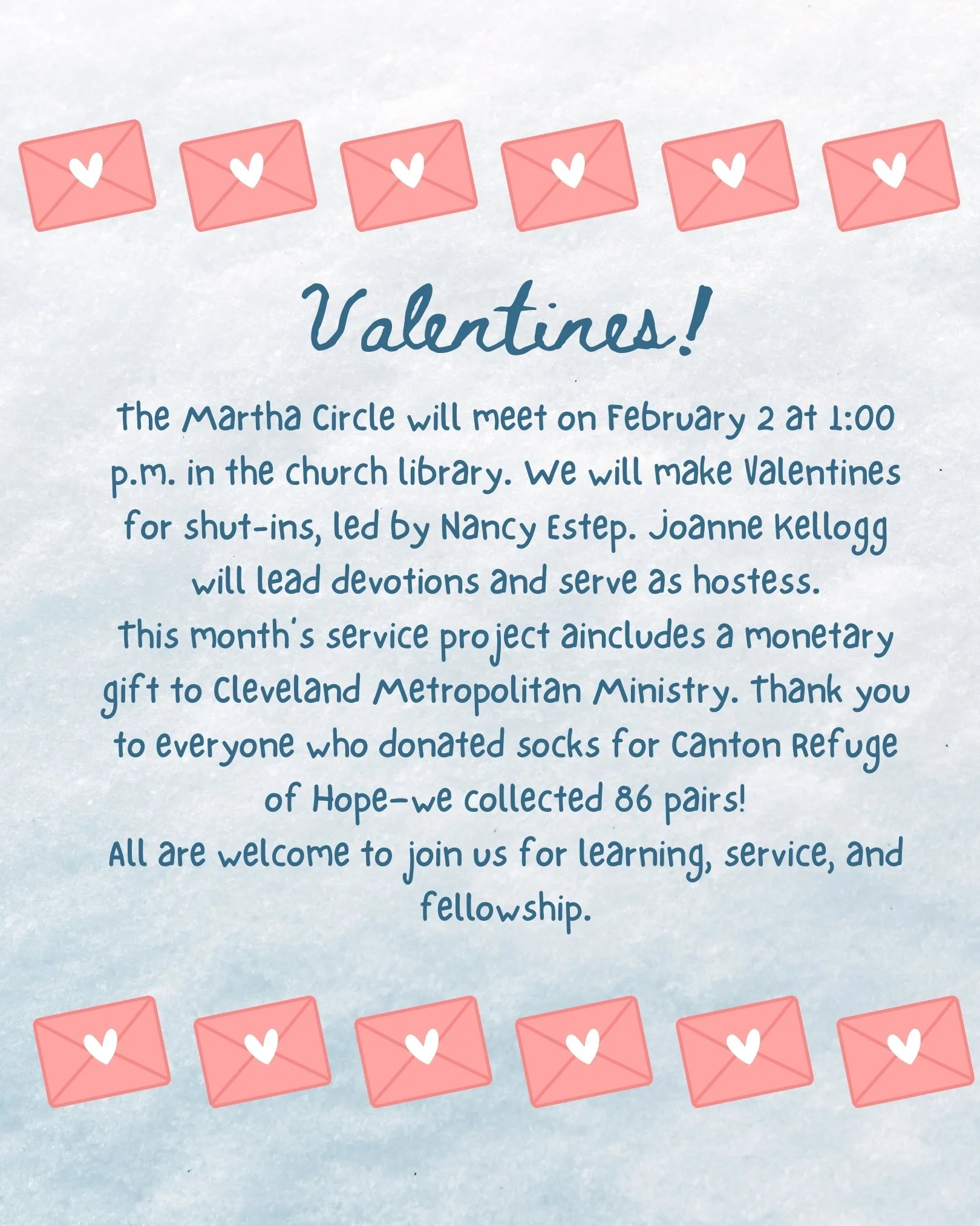 February 15th @ 1:00PM - The Martha Circle will be making Valentines for shut-ins. Come and enjoy the fun!